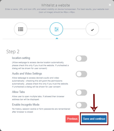 6). And Screen you can set setting location, audio and video, allow multiple tab, enable incognito mode on the browser, tap on save and continue button.